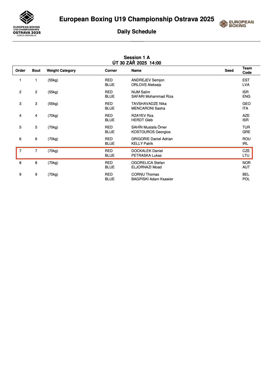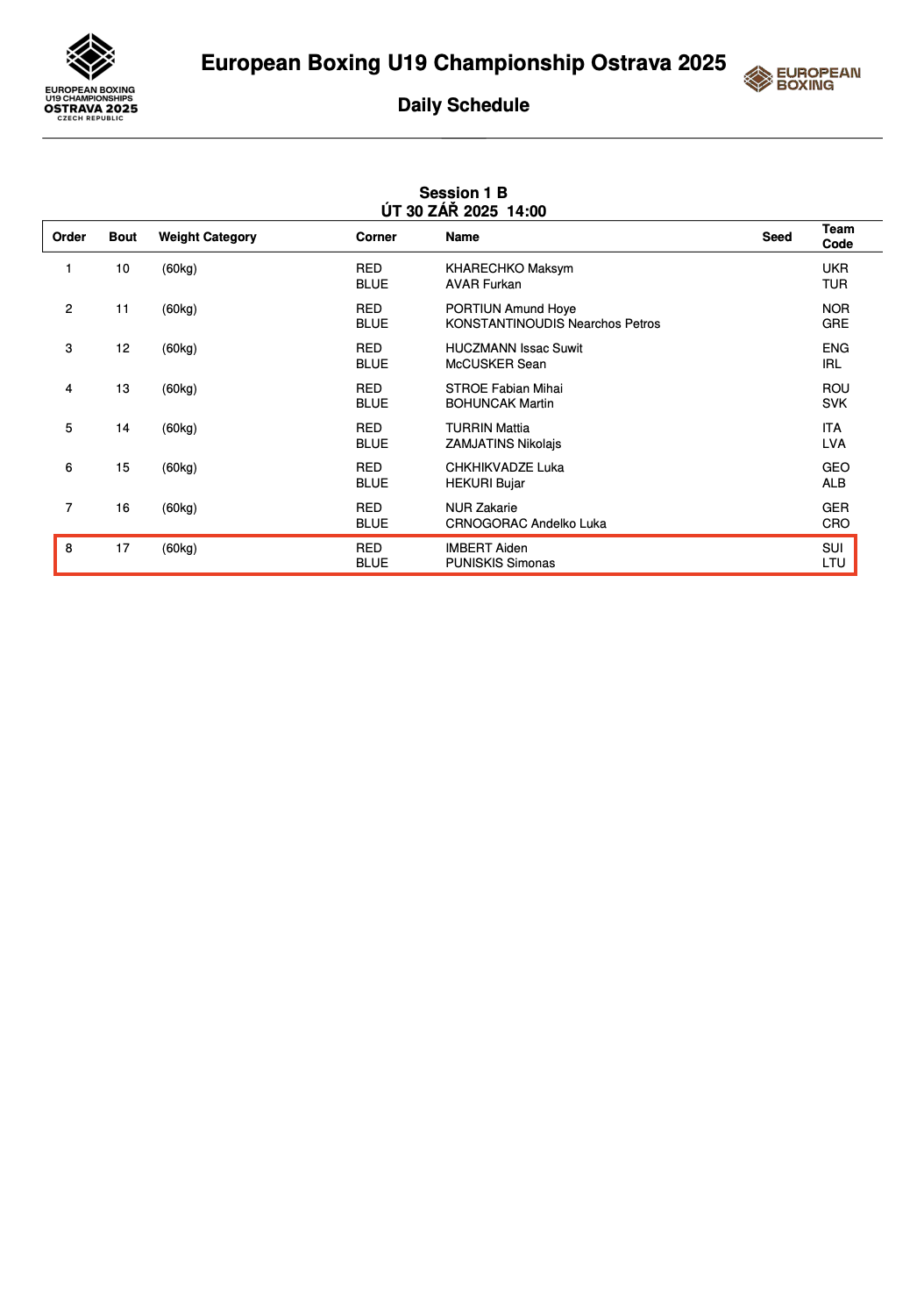 Spalio 1 d. (trečiadienį) Kornelijus Kerpė (iki 50 kg) aštuntfinalyje boksuosis su Kosovo sportininku Riadu Isufi. Tą pačią dieną aštuntfinaliuose boksuosis ir merginos – Milda Altaravičiūtė (iki 51 kg) susitiks su angle Ruby Imogena White, o Jelizaveta Jakimova (iki 54 kg) varžysis su kroate Leonarda Franic.